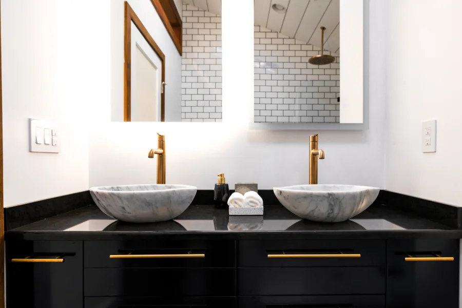 Light up a room using light fixtures and spotlights. Hotel rooms have light switches at the bedside and a nightstand on the side tables. Floor lamps can be added. There are also lights in bathrooms, overhead lights in the vanity area, and the shower room. Dimmers provide mood lighting.